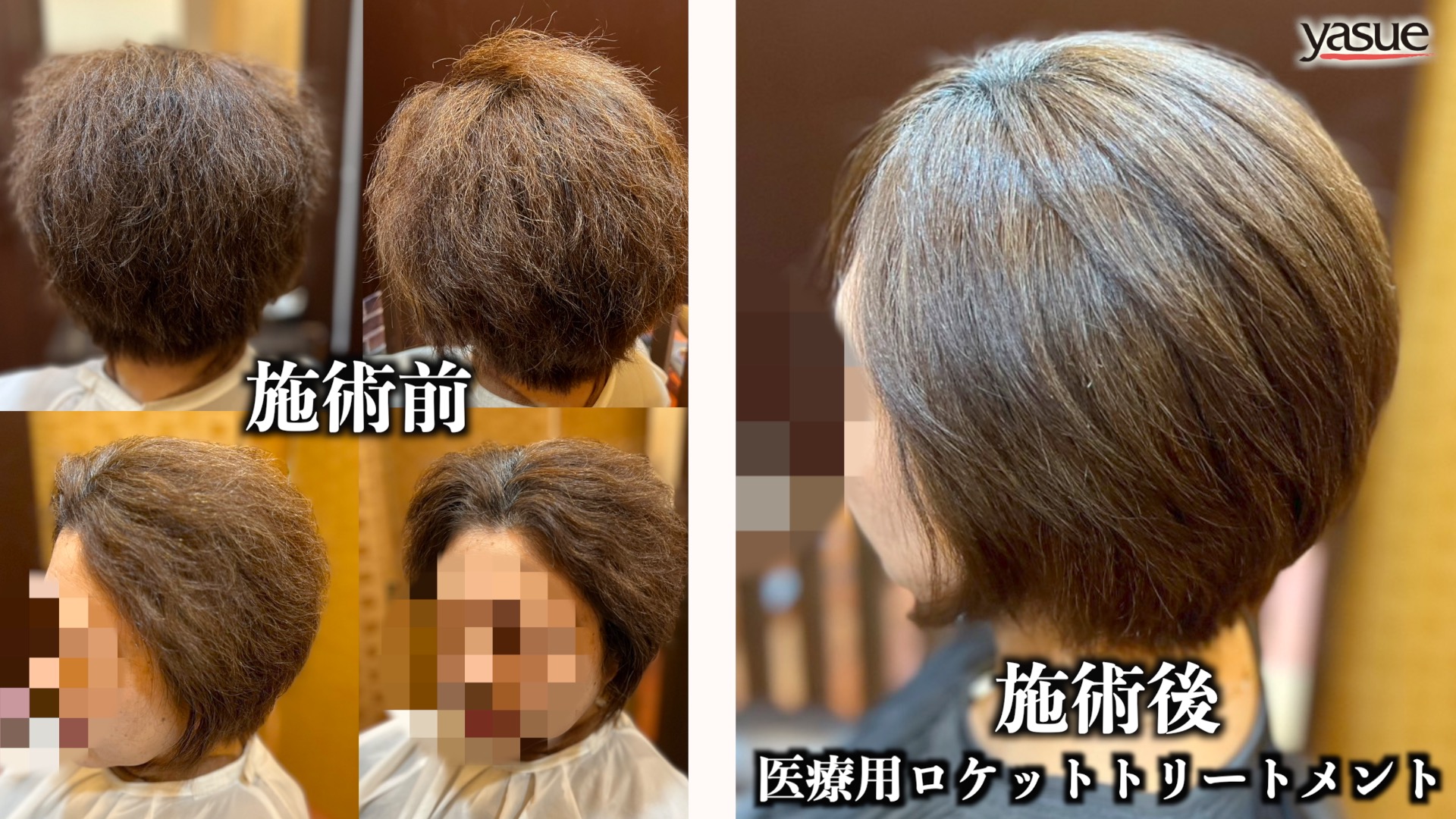 一度 髪の現状の状態を見せて頂く事が一番の近道になると思います。クセの状態も生まれ持った先天的なものなのか、治療による後発的なものなのか、クセ毛の特徴が波状毛(波のようなクセ)、螺旋毛(クルクル捲くクセ)や細い毛、太い毛、乾燥状態など治療された方は 人それぞれ全く違います。髪の体力が回復するまでは我慢が必要です。一般メニューでは、薬剤も発達し、この種類を使うとこの薬剤とこの薬剤が使えないなどの、知らないと髪がボロボロになる相性の悪い薬剤もあり、またヘアカラーを先にすると色落ちが激しくなる特殊な薬剤や、その逆のケースもあります。通常の美容室メニューをされて 髪の内部のPHレベルを急に変化させることはおすすめできません。早くキレイになりたいと思う気持ちも充分にご理解できますが、急ぎすぎると半年後や1年後に その反動でさらに扱いにくい状況になります。YASUE TEAMにはかなりの症例数があり まずは髪の状態を私どもに判断させて下さい。そこからこの先どうされる事が一番お客様にとってベストなのか ホームケアを含めて提案し組み立てさせて頂きます。まずは無料の医療用ロケットトリートメントを体験される事をお勧め致します。
