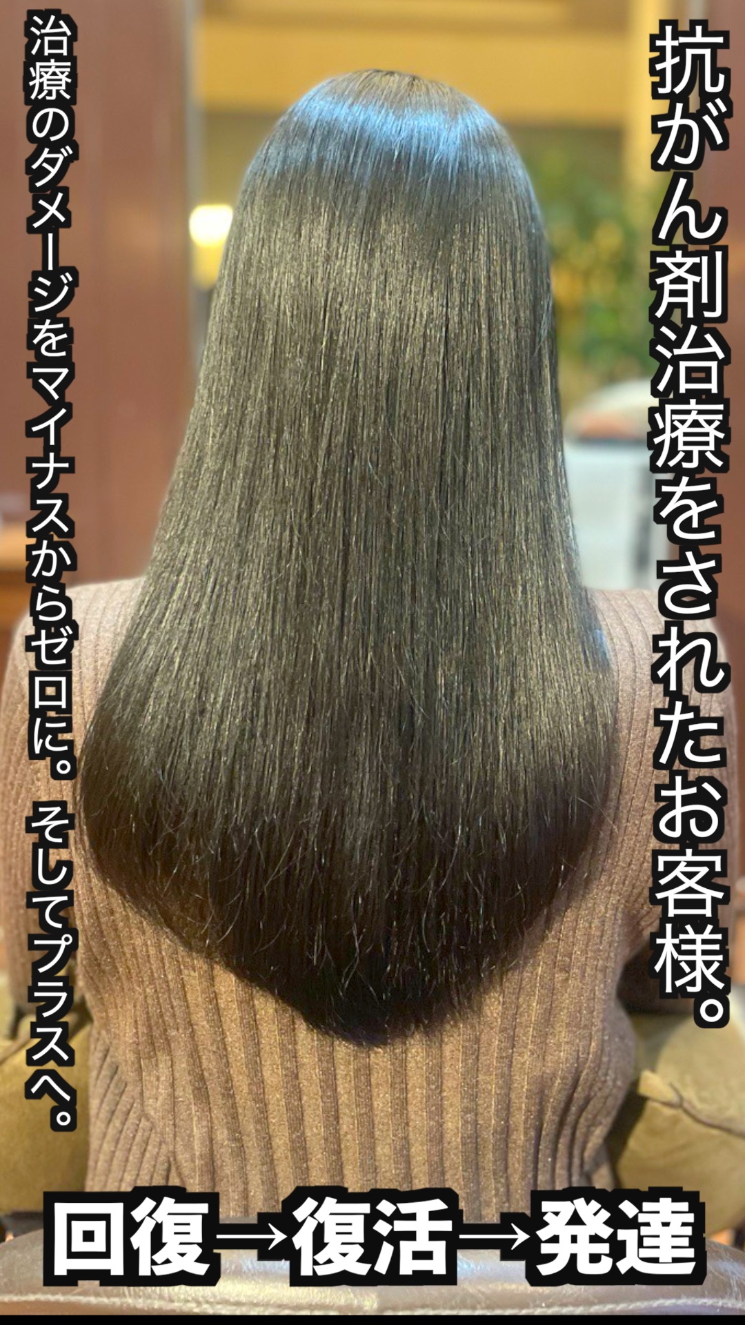 まず最初にご理解頂きたい点がございます。抗がん剤の種類や部位の治療法や遺伝子の掛け合わせにより副作用による髪の症状が、お一人お一人完全に違います。髪が薄くなる症状の方や多毛になる方、髪の太さ、硬さ、治療が終わった時期などで全て状況が違う事をご理解ください。ご想像する事ができないほどの かなりの個人差があります。一度の施術で効果が出やすい方や、持続性が保たれる方、その反対の方もいらっしゃいます。その方の元々の本質的な髪に近づける為に、最初にすることはダメージレベルをマイナスからゼロに戻す施術を心がけて行います。