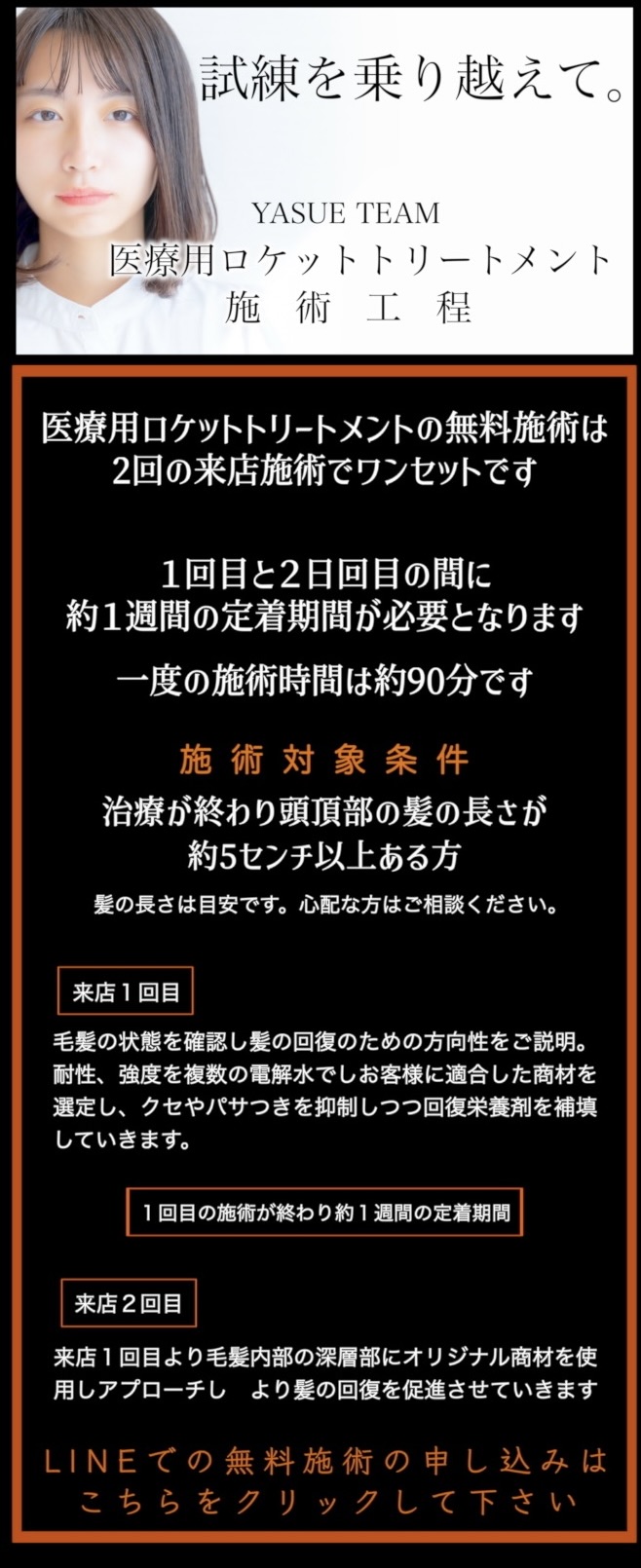 治療をされて髪を見せる事に 抵抗を感じている方も多いと思います。でもそんな事は気にしなくて良いのです。あなたは誰よりも辛い経験を乗り越えて また頑張ろうと思っている方に違いはありません。そんな方をYASUE TEAMは全力でサポートさせて頂きます。LINEまたはお電話にてお問い合わせを頂きご来店下さい。YASUE TEAMには沢山の経験があります。闘病、治療を経験された方には「医療用ロケットトリートメント」を無料で施術し、皆さんのお力になりたいと思います。詳細につきましては、このページを最後までご覧ください。
